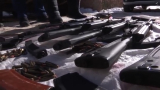 Задержание злоумышленников проходило во дворе многоэтажного дома. Спецслужбы также продемонстрировали изъятые при аресте пистолеты, ножи