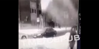 На записи видно, как на идущую горожанку сверху падает снеговая масса