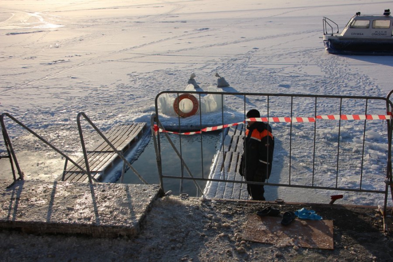 Ледяную прорубь на набережной охраняют несколько десятков сотрудников МЧС, полицейских, дежурили врачи скорой помощи. На месте купаний установлена палатка службы спасения, где можно переодеться или согреться после омовения.