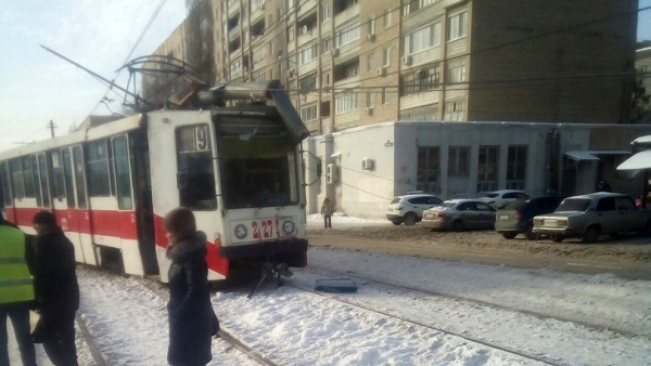 В Саратове трамвай сошел с рельсов и протаранил знак «Пешеходный переход»