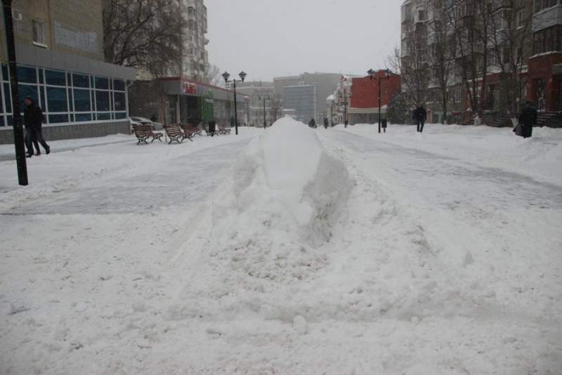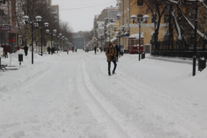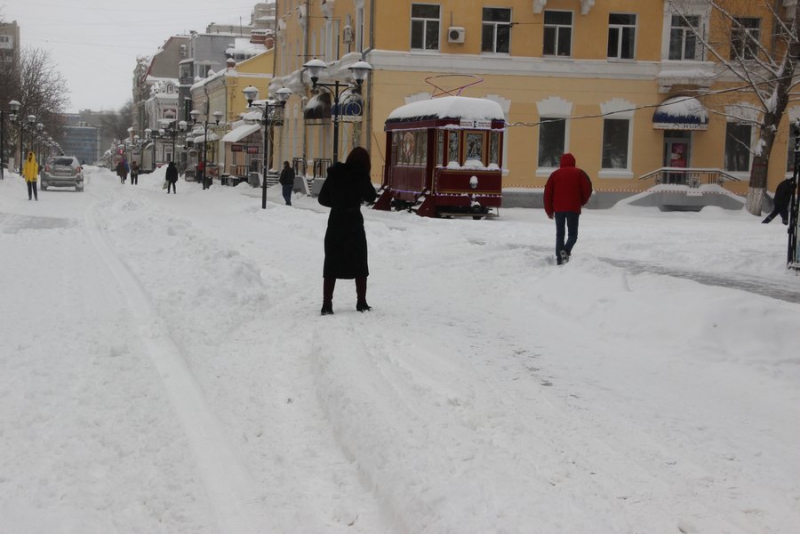 Наконец, несмотря на то, что ведется уборка пешеходной улицы Волжской, здесь много снега. Начиная от трамвая «Семен» и до пересечения с Октябрьской люди прыгают через высокие сугробы в центре и по краям.
