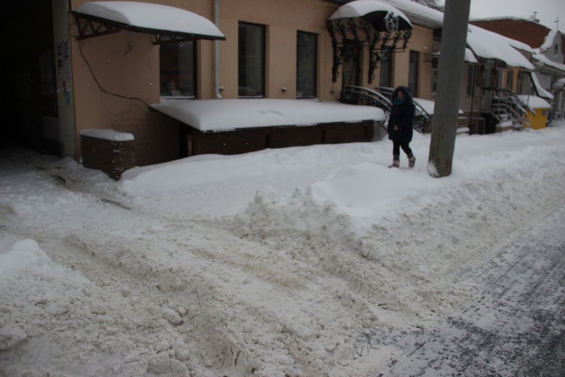 Сложнее всего передвигаться по Театральной площади – здесь снег не чищен вовсе, а еле протоптанные дорожки не дают возможности идти даже медленным шагом. Несколько участков улицы Московской (даже рядом с правительством области) не очищены как следует, во всю ширину тротуара, и люди вынуждены тесниться, чтобы обойти снежное препятствие. Кроме того, легкий слой снега уже присыпал здесь тротуар, а вот на соседние улицы – Некрасова, Октябрьскую, Соборную – лучше не спускаться – придется пользоваться теми же скромными тропками, проложенными пешеходами.