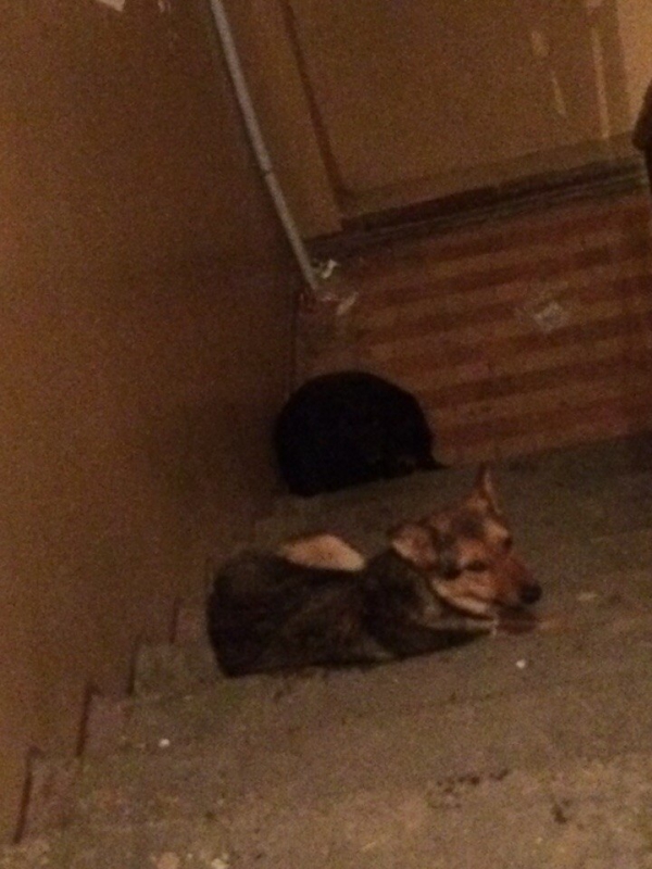 По ее словам, это происходит в 5-этажном доме №64. К сообщению приложены фотографии, на которых собаки лежат на ступеньках лестниц (под снимком сообщается, что это 5 этаж). Там же валяется перевернутая коробка с едой.