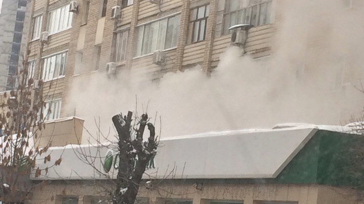 Очевидцы опубликовали фото в социальных сетях. По ним видно, что дым валит из окон квартиры на втором или третьем этаже, расположенных прямо над «Сбербанком».