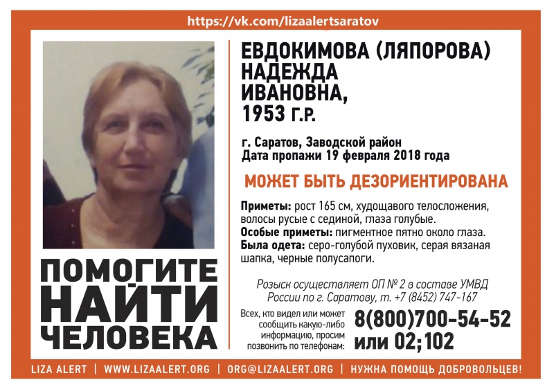 Всем, у кого имеется информация о местонахождении саратовчанки, просьба позвонить по телефонам: (8452) 747-167 (отдел полиции №2), 8-800-700-54-52 («Лиза Алерт») или 02 (с сотового 102).