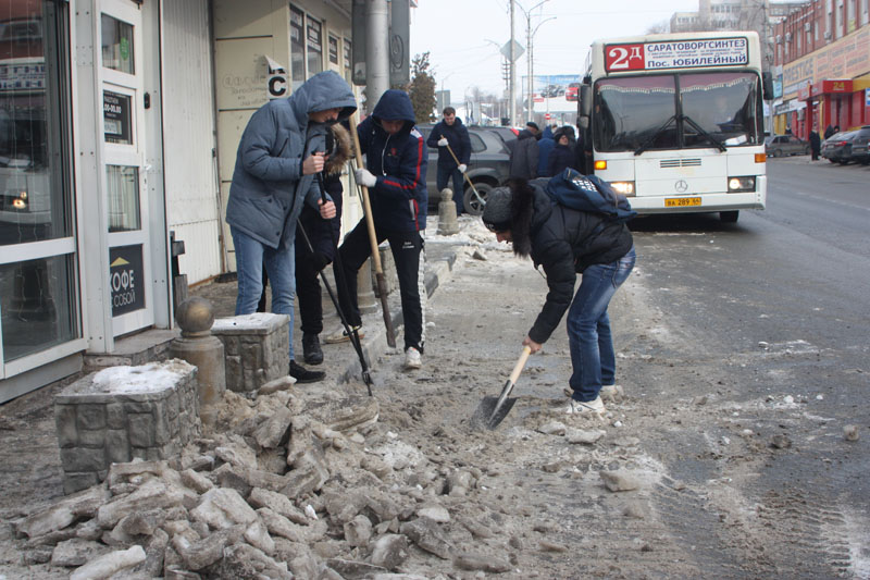 Сегодня студенты Саратовского социально-экономического института РЭУ им. Г.В. Плеханова поддержали инициативу губернатора Валерия Радаева по расчистке города от снега и наледи. Активисты института очистили прилегающую к Эконому территорию на улицах Большая Горная и Радищева, пешеходные дорожки и автобусные остановки.