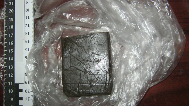 В свертке, обернутом скотчем, была обнаружена темно-коричневая масса растительного происхождения. Экспертиза показала, что это гашиш массой 86,9 граммов. Такой объем наркотиков считается крупным размером.