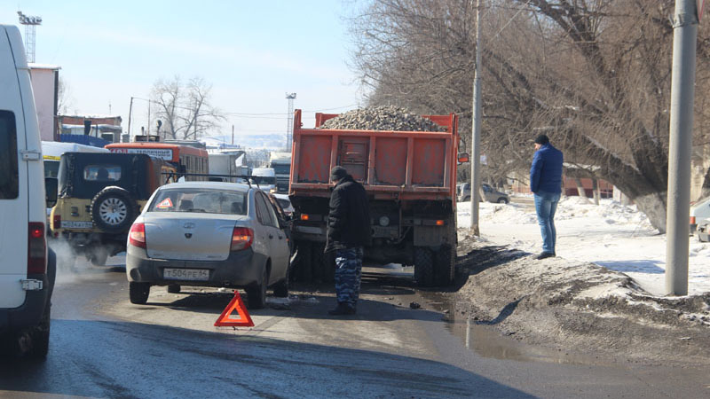 По предварительным данным, «КамАЗ» ехал из центра по Ново-Астраханскому шоссе по правому ряду, в районе остановки «Парикмахерская» к нему «притерся» автомобиль «ВАЗ-2110» с левого ряда. При этом в «десятку» врезалась «Лада Гранта», ехавший позади.