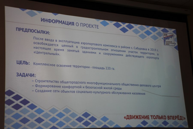 Она представила комплексное развитие территории площадью 220 га в Кировском районе. После ввода в эксплуатацию комплекса аэропорта в районе села Сабуровка в 2019 году освобождается ценный в градостроительном отношении участок территории, на котором в данный момент располагаются действующие здания и аэропорт «Центральный».