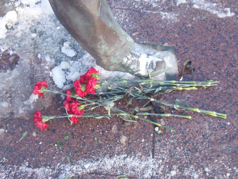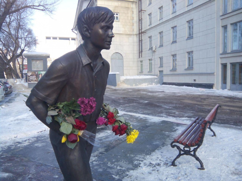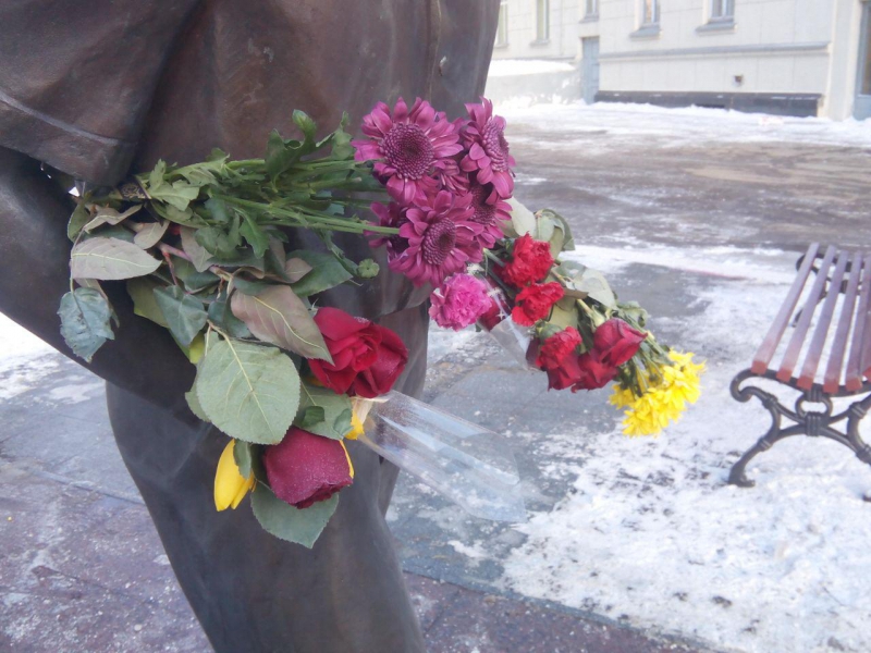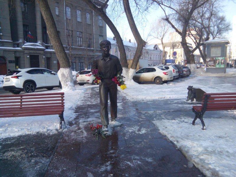 Люди несут букеты к композиции к театру оперы и балета, изображающей героя Табакова из советского фильма «Шумный день», там же «сидит» кот Матроскин, которого артист озвучивал. Накануне площадку очистили от снега и наледи. Напомним, памятник был открыт в 2015 году в присутствии самого знаменитого земляка.