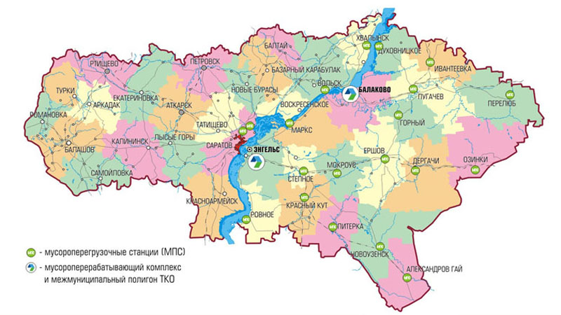 Согласно территориальной схеме по обращению с ТКО, в зону деятельности регионального оператора входят следующие муниципальные районы: Александрово-Гайский, Балаковский, Вольский, Дергачевский, Духовницкий, Ершовский, Ивантеевский, Краснокутский, Краснопартизанский, Марксовский, Новоузенский, Озинский, Перелюбский, Питерский, Пугачевский, Ровенский, Советский, Федоровский, Хвалынский, Энгельсский, ЗАТО Михайловское, ЗАТО Шиханы, МО «Город Саратов».