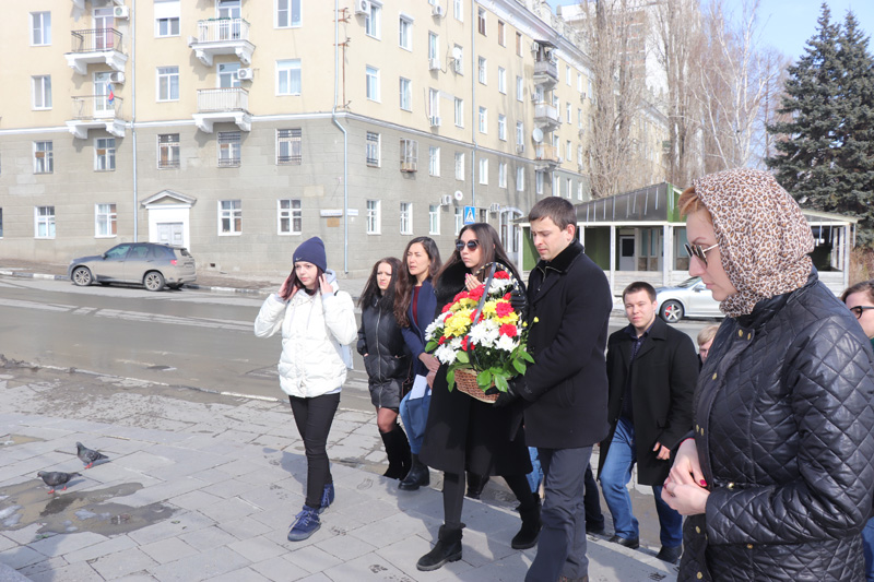 Траурная церемония началась с минуты молчания в память о погибших 25 марта при пожаре в Кемерово. Затем студенты возложили цветы к подножию памятника Юрию Гагарину.