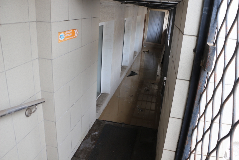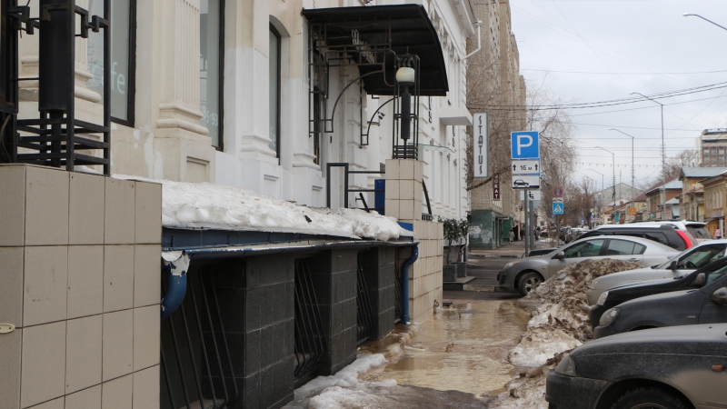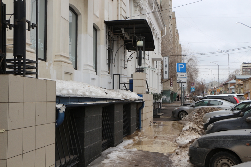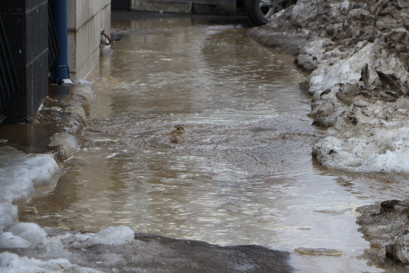 Пешеходную дорожку полностью затопило, поэтому горожанам приходится выходить на проезжую часть, чтобы обойти препятствие. По табличкам на стене дома становится ясно, что раньше на цокольном этаже располагался офис коммерческой фирмы, но сейчас помещение закрыто.