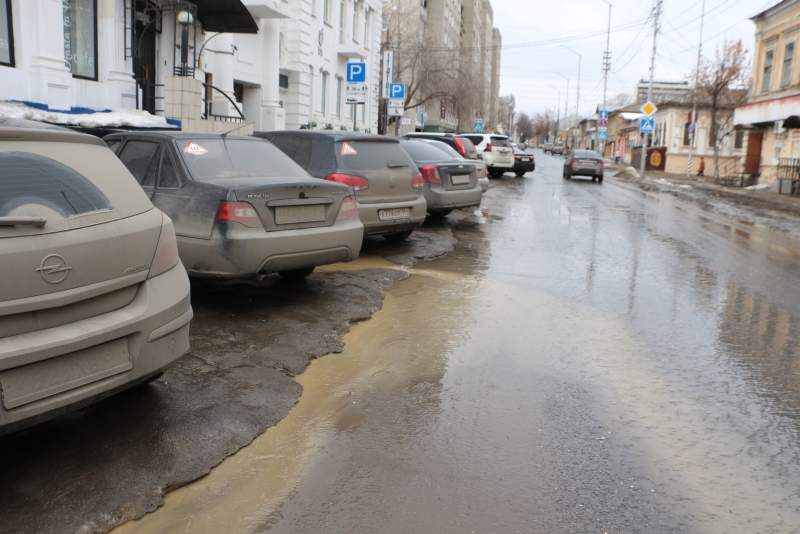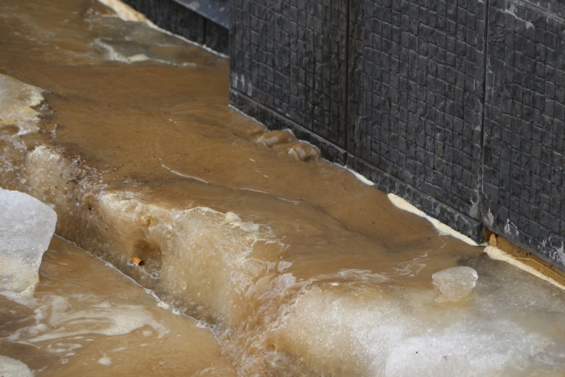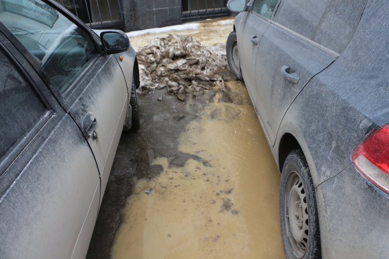Тротуар у дома №61 залило водой песчаного цвета. Источников излива два – трещина в дорожном покрытии на тротуаре и стык дороги со стеной подвала. При этом сам подвал тоже заполнен жидкостью.