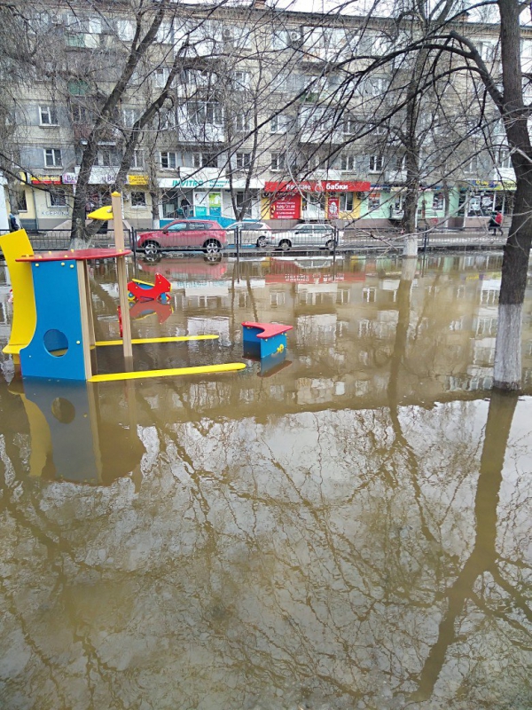 На фотографии видно, что качели, песочница и другие аттракционы на аллее залиты водой, подойти к ним невозможно.