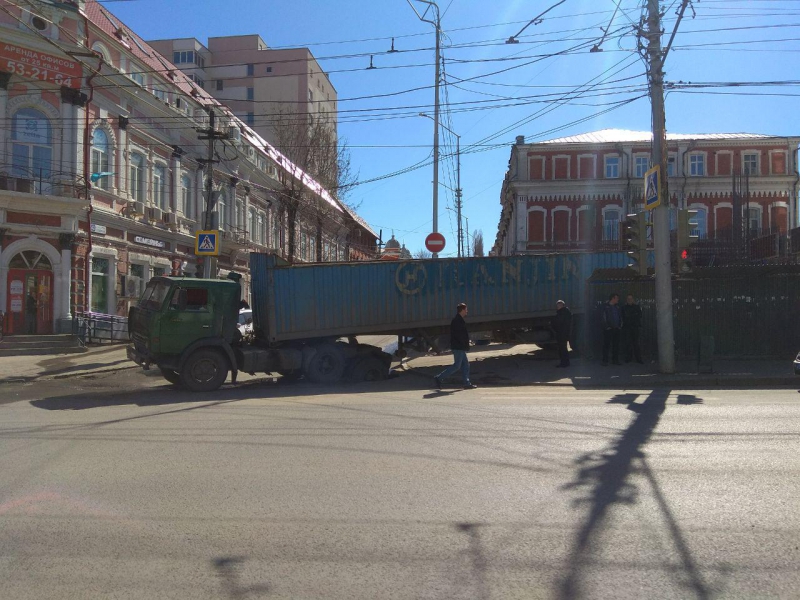 В центре Саратова «КамАЗ» провалился в яму и перекрыл движение по Соборной