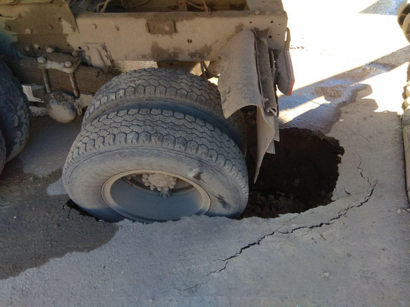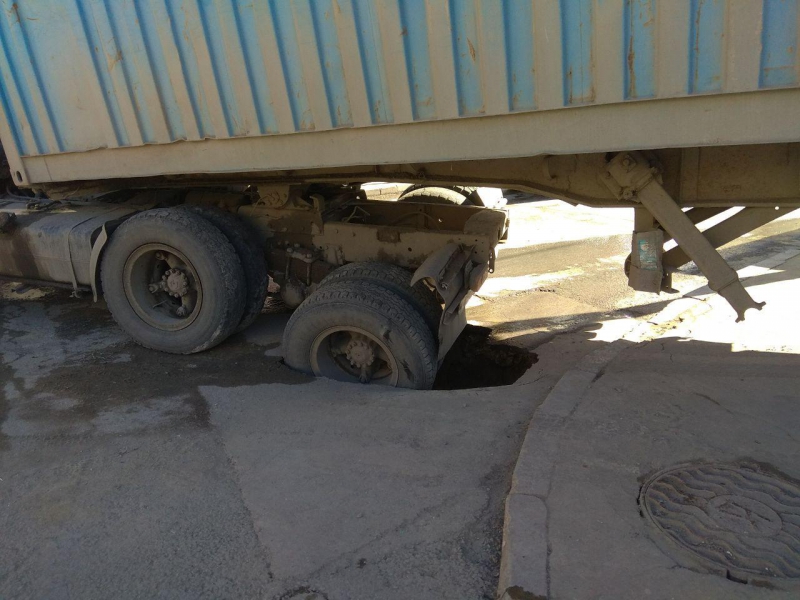 Как рассказал «Четвертой Власти» очевидец, «КамАЗ» выезжал с территории стройки на улице Московской, 55. Колесо автомобиля провалилось в яму на проезжей части. Предположительно, под асфальтом оказался размытым грунт и под тяжестью грузовика образовался провал.