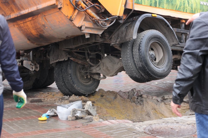 Напомним, ЧП случилось примерно в 8.30, рядом с колодцем у грузовика внезапно ушло под землю заднее колесо. Водитель не пострадал.