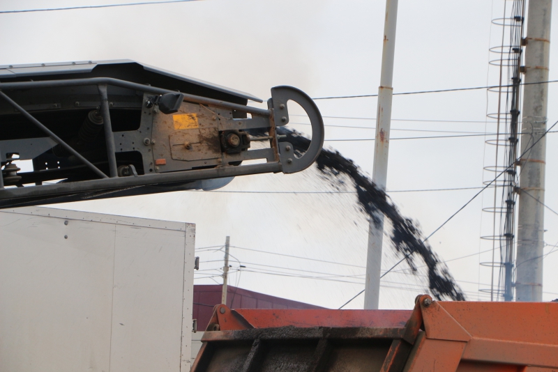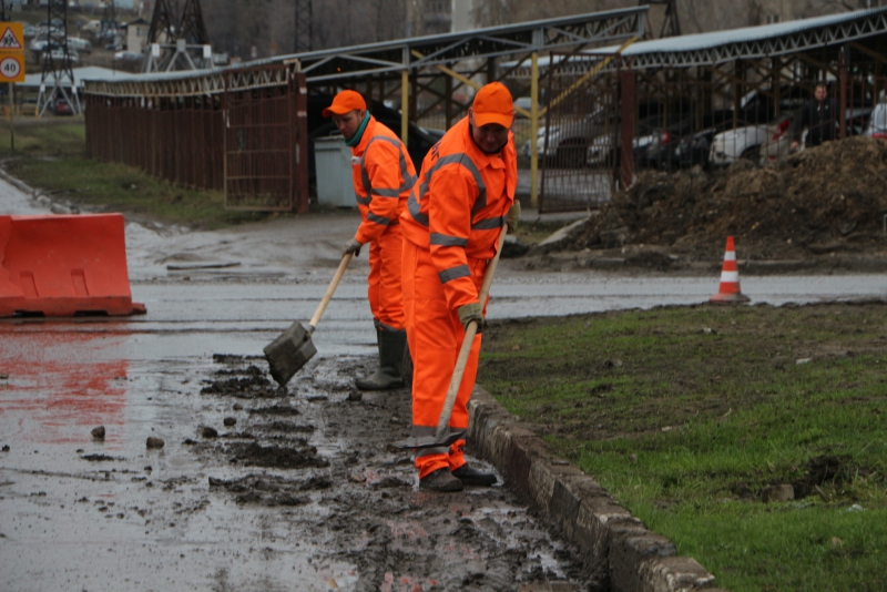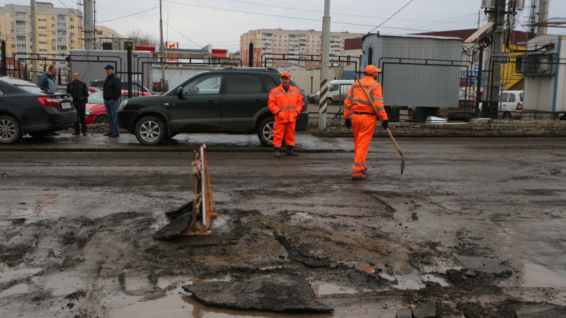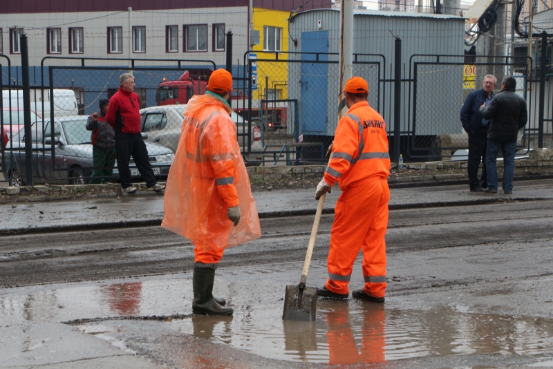 До приезда чиновников рабочие на фрезерной машине снимали верхний слой асфальта у поворота на Перспективную. В это время их коллеги с лопатами в руках вычерпывали лужи, чтобы технике было проще работать.