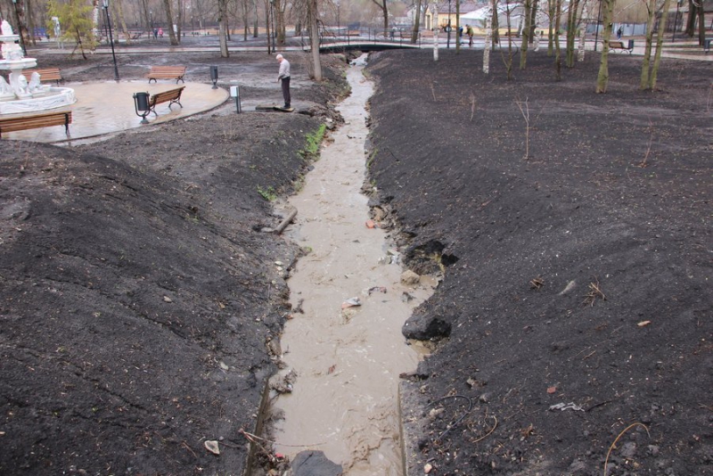 В двух местах парка Володин обратил внимание на лужи и размытую землю. Он предложил создать дополнительный искусственный ручей, чтобы избежать этого.