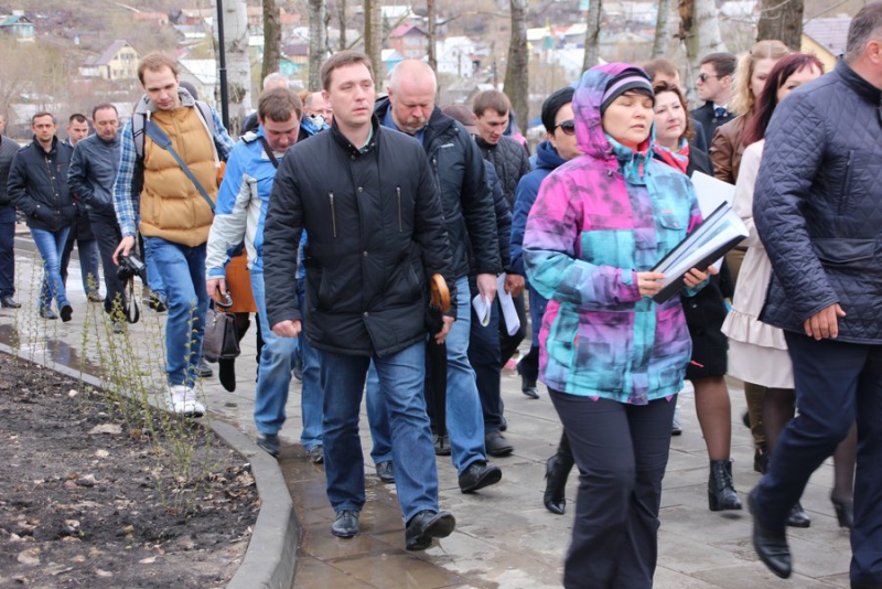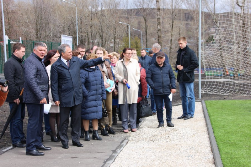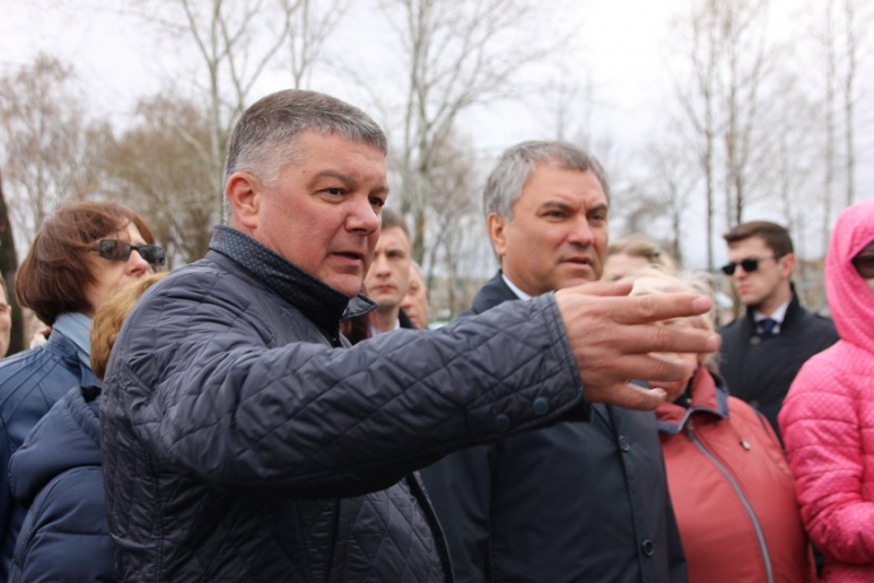 Председатель ГД начал свой визит с главного входа в парк около пешеходной зоны. Он спросил у инициативной группы, все ли идет по плану. Они ответили, что все хорошо и что рады, что после зимы парк «не поплыл», дорожки не разрушены.
