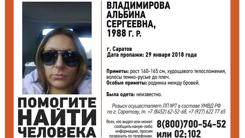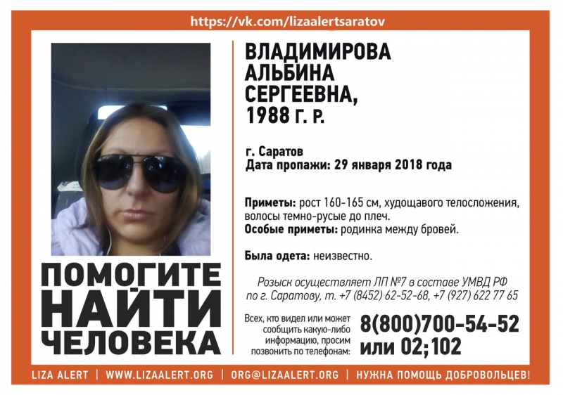 В Саратове нашли пропавшую в конце января 30-летнюю Альбину Владимирову. Об этом несколько минут назад сообщили сотрудники поискового отряда «Лиза Алерт» в соцсетях.