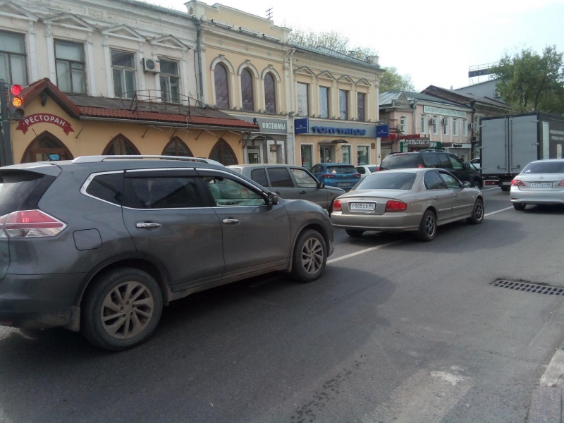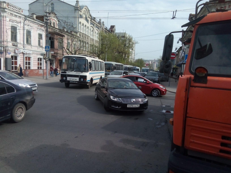 Затору способствует объезд общественным и личным транспортом парада на Московской по прилегающим улицам, а также несколько ДТП в центре. Автобусы из Энгельса по центральной улице Саратова пускают только до пересечения с Чапаева, далее они поворачивают на Большую Горную.