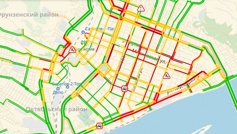 В эти минуты в Саратове наблюдаются 8-балльные (многокилометровые) пробки. О напряженной ситуации на дорогах сообщает приложение «Яндекс. Пробки».