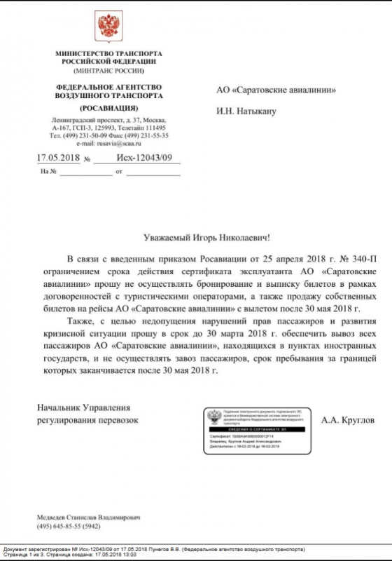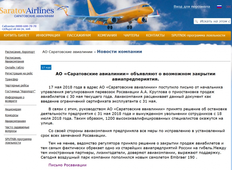 «В связи с этим, руководством АО «Саратовские авиалинии» принято решение об остановке деятельности предприятия с 31 мая 2018 года и вынужденном увольнении сотрудников с 18 июля 2018 года. Таким образом, 1200 высококвалифицированных специалистов окажутся на улице», - заявил авиаперевозчик.