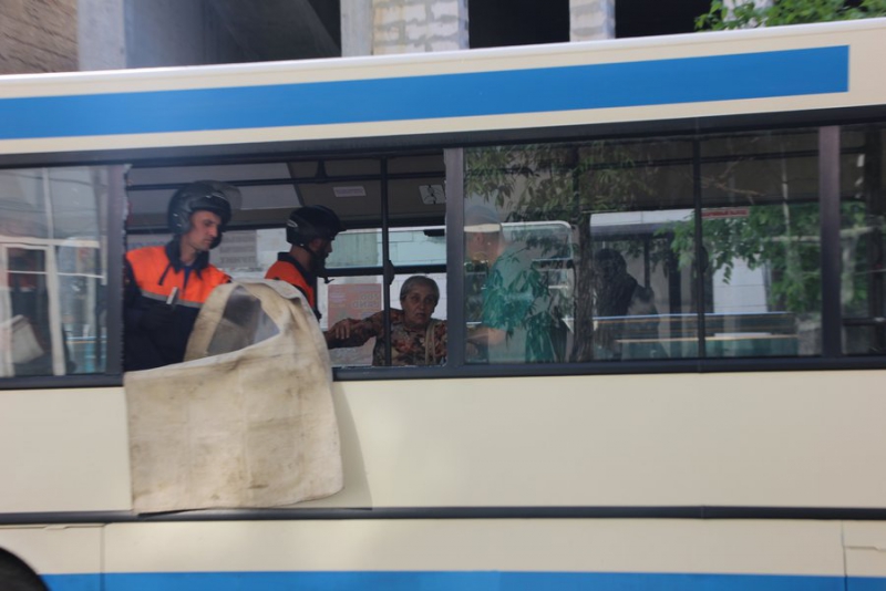 Пожилая женщина по состоянию здоровья не смогла выбраться через окно, как десятки других пассажиров. Спасатели и полицейские «расцепили» притершиеся друг к другу автобусы. Два сотрудника облспаса вывели из салона женщину. Она сильно хромала на правую ногу. Видимых повреждений: ссадин, ушибов – журналист не заметил.