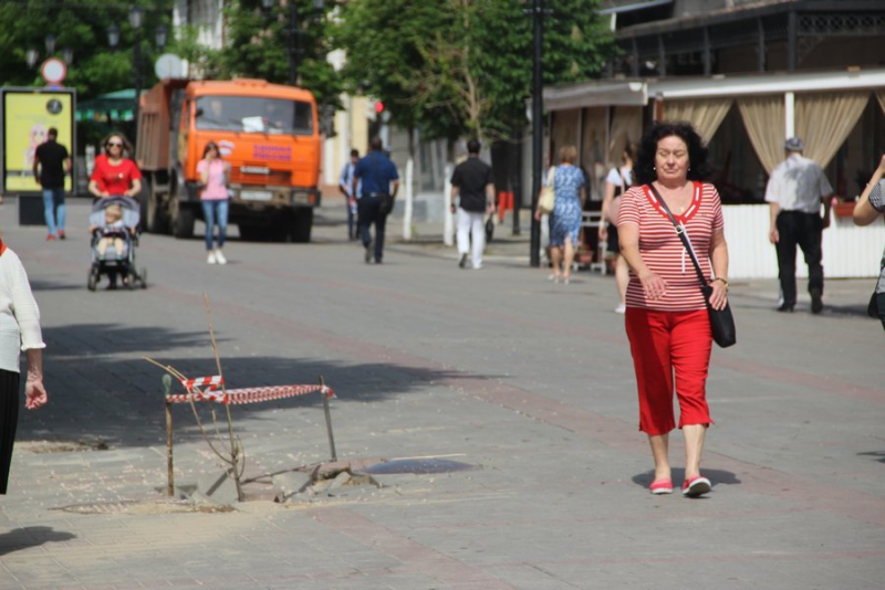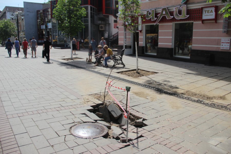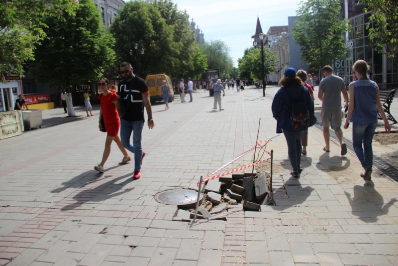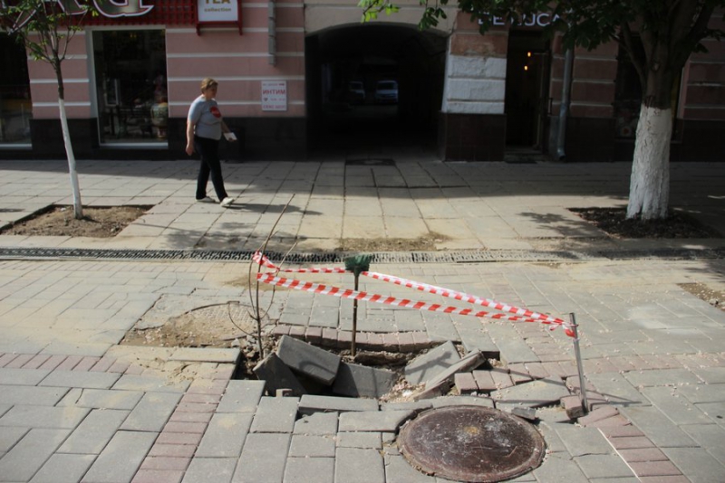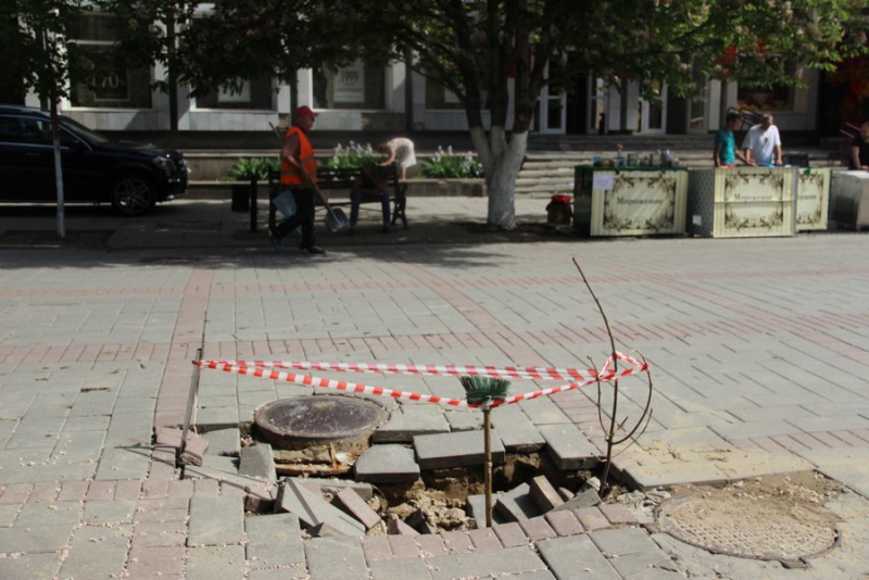 Напомним, вчера недалеко от кинотеатра «Пионер» под землю ушла часть пешеходной зоны. Провал около метра в длину и ширину, глубина его около 40 см. Днем ранее из-под плитки рядом с одним из колодцев длительное время текла вода.