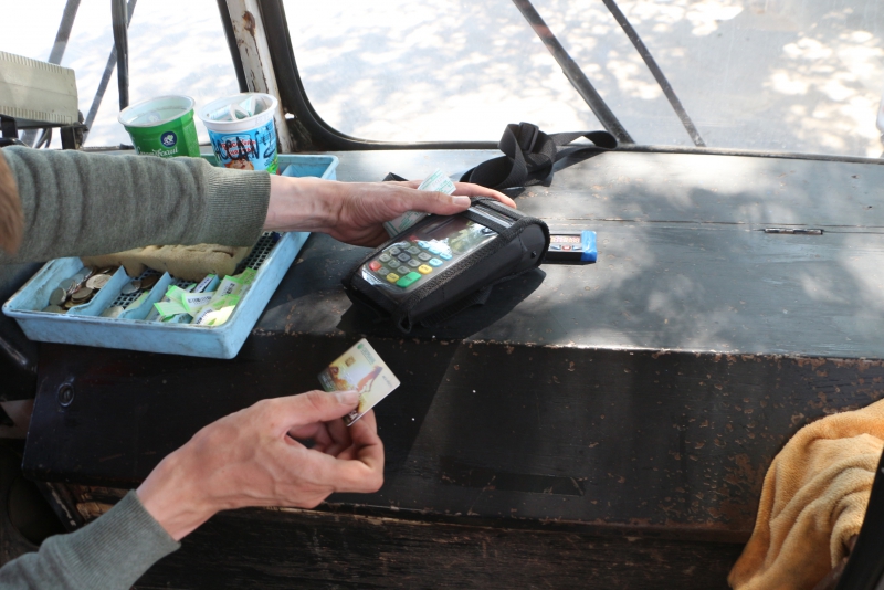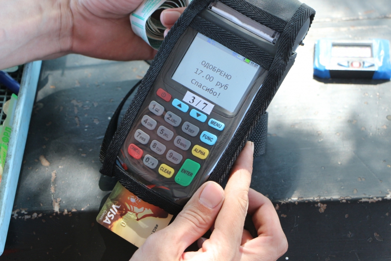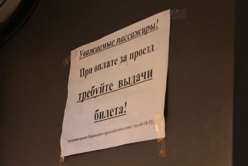 Кондуктора в троллейбусе не оказалось, поэтому оплату принимал водитель. На панели рядом с коробкой с деньгами располагался мини-терминал, о предназначении которого знали, казалось, только водитель и журналист. О том, что теперь расплатиться можно банковской картой или через специальное приложение на смартфоне сообщали лишь наклейки на стеклах. Однако понять их содержимое под силу только молодым саратовцам, нарисованы там только логотипы платежных систем.