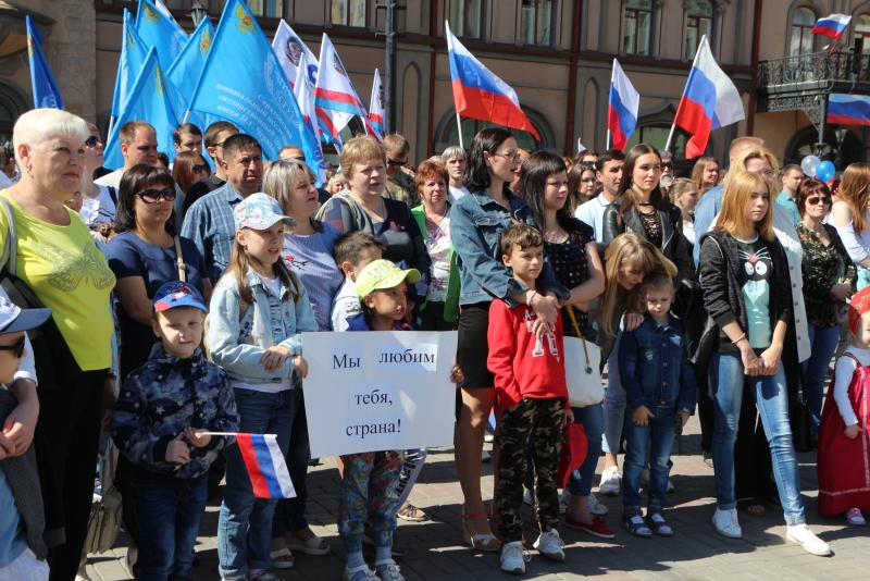 Почти все участники митинга держали в руках флаги Российской Федерации, некоторые из них пришли с плакатами, на которых было написано «Я люблю Россию», «Россия – страна возможностей», «В единстве наша сила».