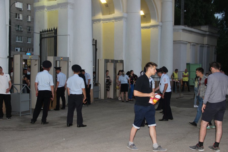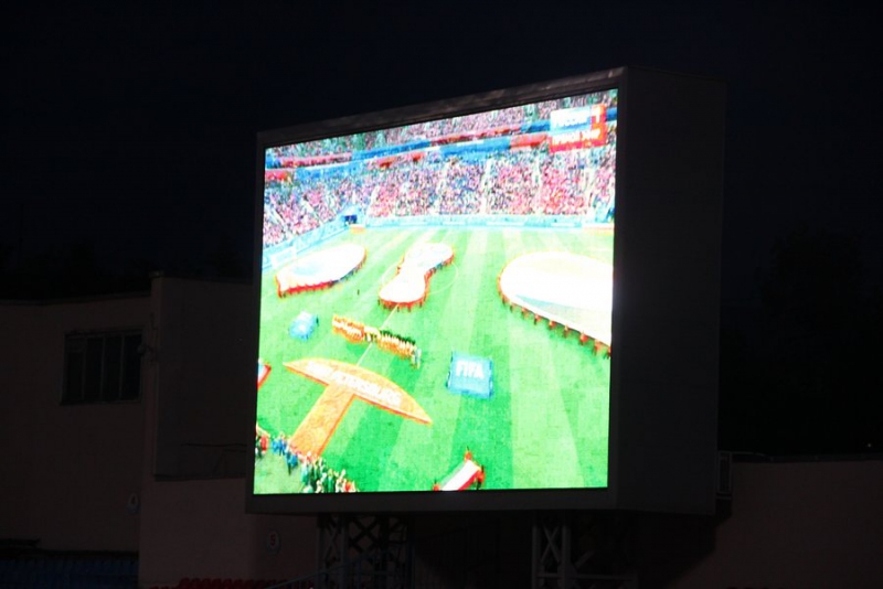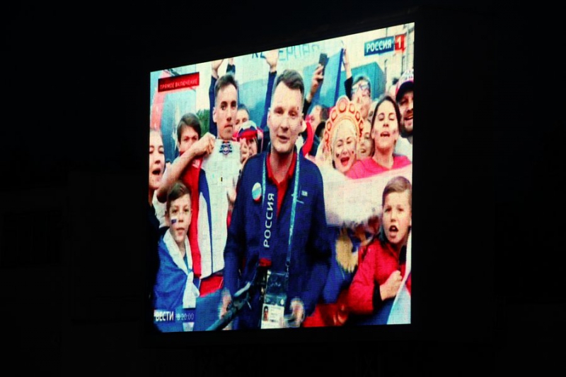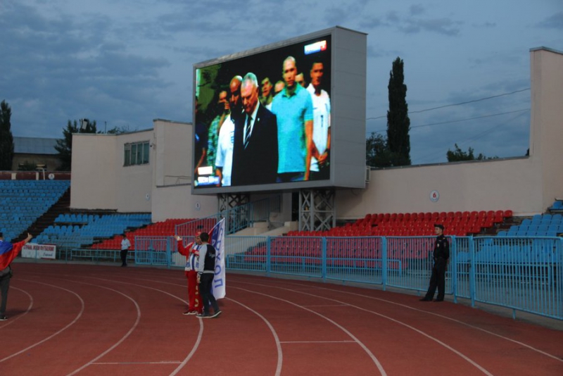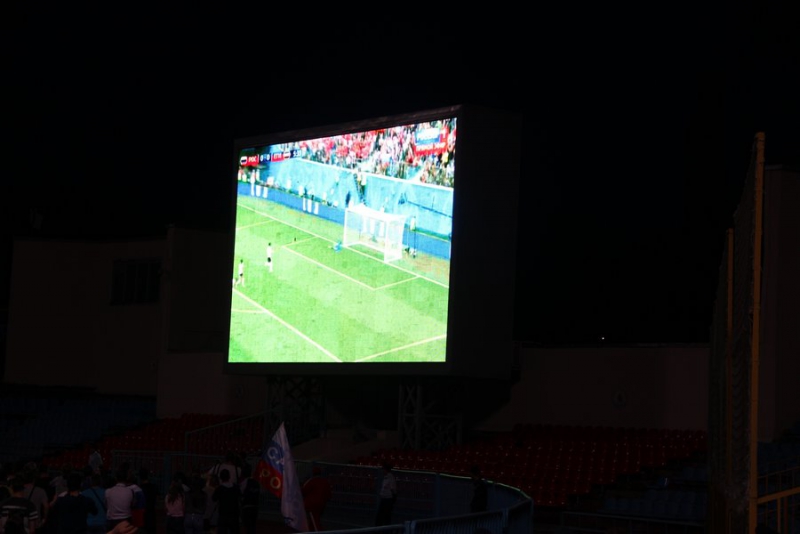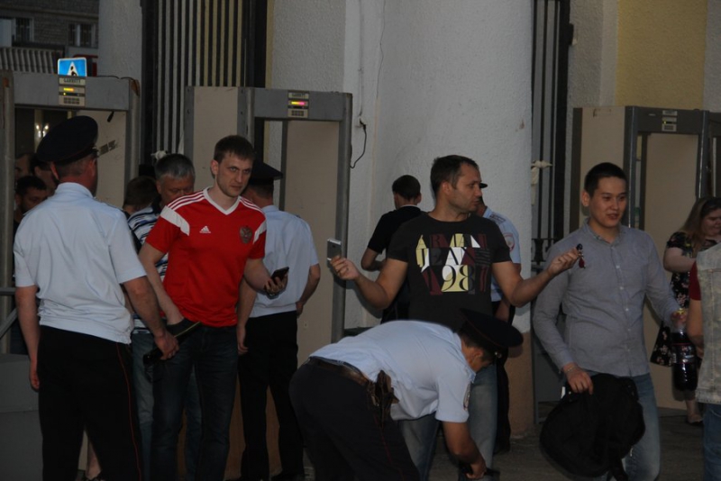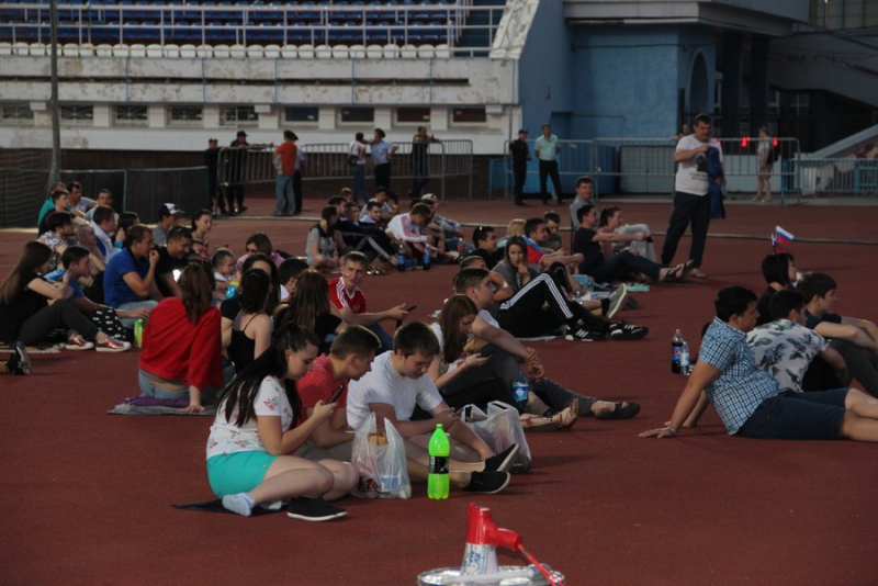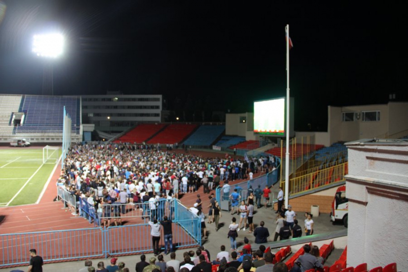 Уже за 40 минут до начала матча у стадиона толпились зрители. Некоторые приехали на автомобилях и доставали флаги. Причем не только российские, но и египетские. Пришедшие на матч люди расселись на площадке перед большим экраном, трибуны тоже заполнены болельщиками. За порядком наблюдают сотрудники полиции.