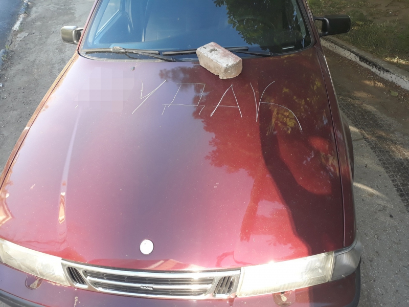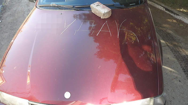 Тем не менее, кто-то большими буквами нацарапал на капоте ругательное слово «*удак», а также положил сверху кирпич.