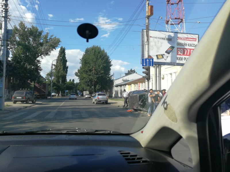 В результате столкновения одна автомашина вылетела на тротуар и перевернулась на бок. О пострадавших пока не сообщается.