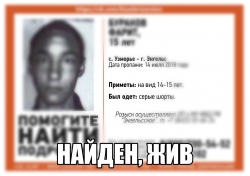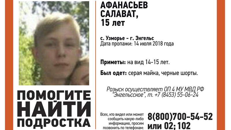 Вчера вечером поисковики сообщили, что один из мальчиков, Фарит Бураков, найден живым. Поиски остальных ребят продолжаются. Всех, кому что-то известно, просят звонить по телефонам 8 (8453) 55-06-24 (отдел полиции №4 МУ МВД РФ «Энгельсское»), 8 (800) 700-54-52 или 112.