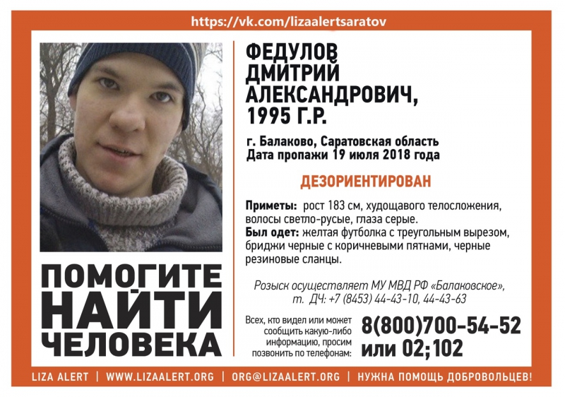 В Балакове Саратовской области пропал 23-летний Дмитрий Федулов. Об этом сообщает поисковый отряд «Лиза Алерт».