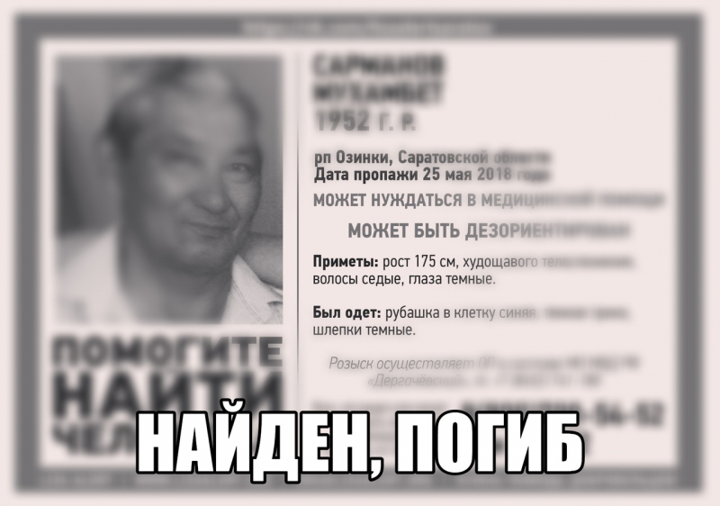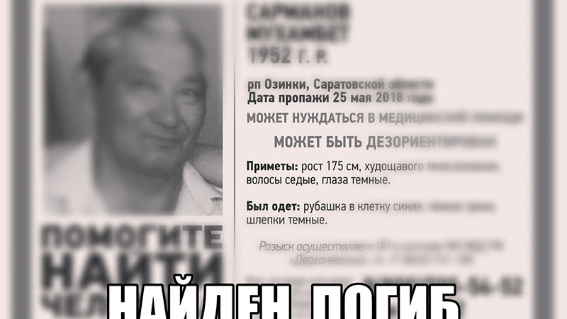 Пропавший в поселке Озинки Саратовской области 65-летний Мухамбет Сарманов найден погибшим. Об этом написали в группе поискового отряда «Лиза Алерт».