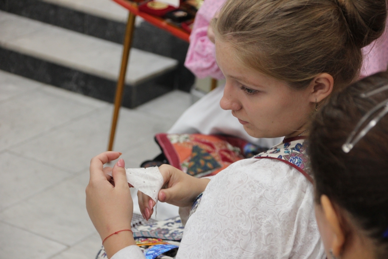 В Саратовской областной думе три девушки шили лоскутное одеяло