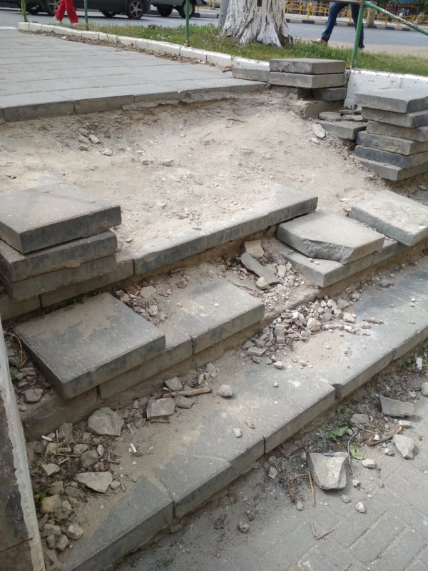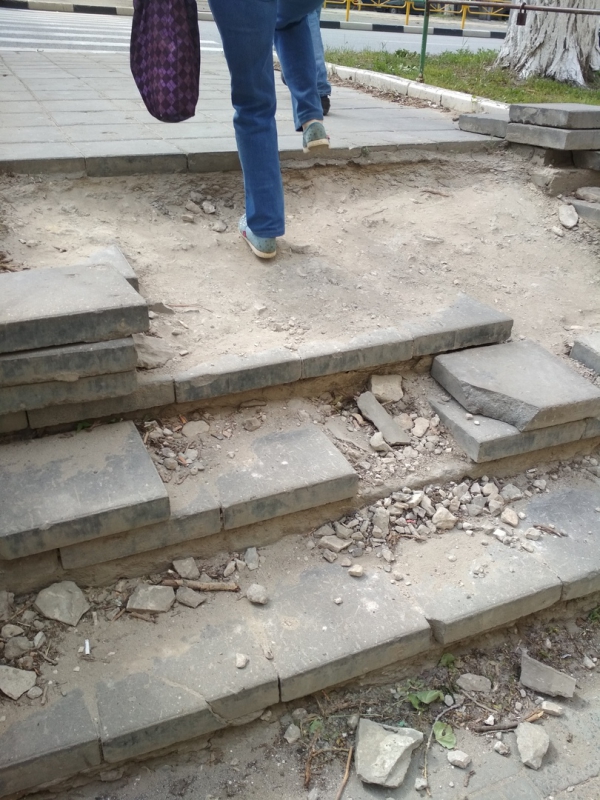 На приложенных снимках видно сильно разрушенную лестницу, у которой отсутствуют некоторые ступеньки. Плитки, из которых состоят другие, расколоты. Часть их сложена в стопку на спуске. Примечательно, что сразу за лестницей расположен пешеходный переход. По словам очевидцев, он расположен напротив дома №57 по проспекту Энтузиастов, неподалеку от Крымского проезда.