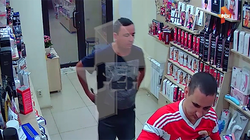 На кадрах видно, как покупатели осматривают интимные товары, что-то считают. В руках у одного из них телефон. В какой-то момент второй из них, в синей майке, берет с полки плетку и кладет ее в задний карман шорт. Он подходит ко второму мужчине и после этого выходит с товаром из помещения.