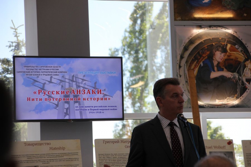 Петер Теш отметил, что выставка символично открылась 1 августа, в день памяти погибших в Первой мировой войне. Он рассказал о саратовцах, которые воевали за Австралию. Например, об Андрее Егорове, который после двух лет на западном фронте не смог перенести всех тяжестей войны и покончил с собой. О Петре Порохе, который воевал кавалеристом в Первую Мировую и погиб на поле сражения в Ливии во время Второй Мировой войны. О братьях из села Перекопное - Алексее и Николае Тупиковых.