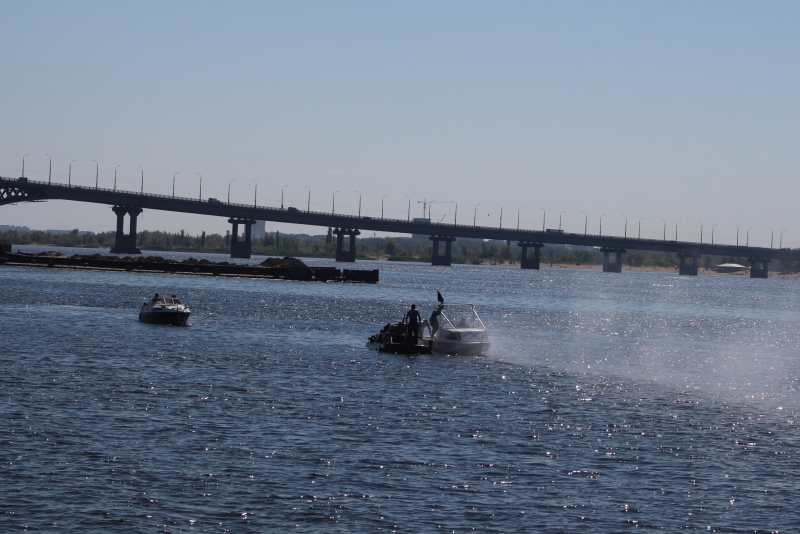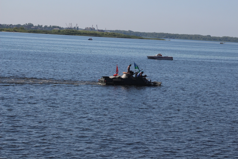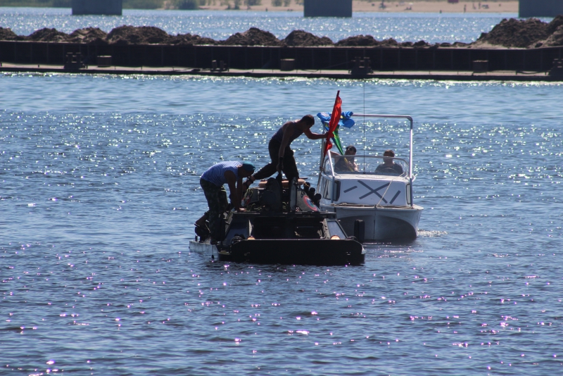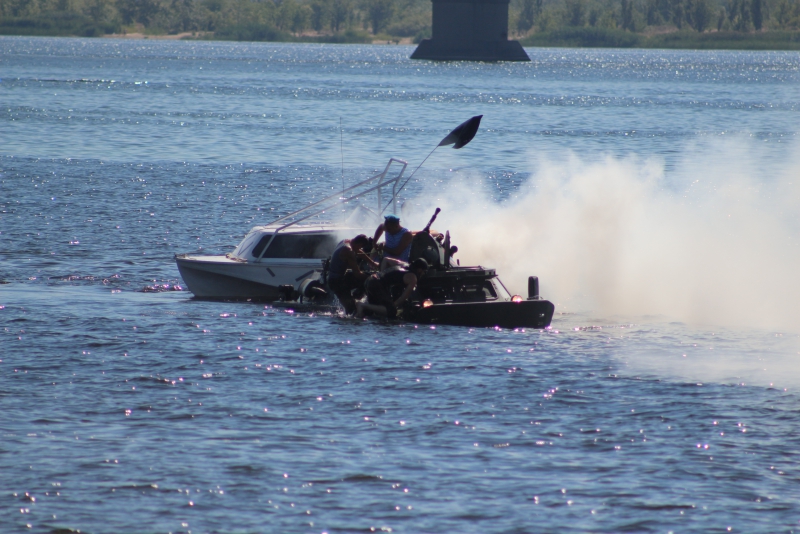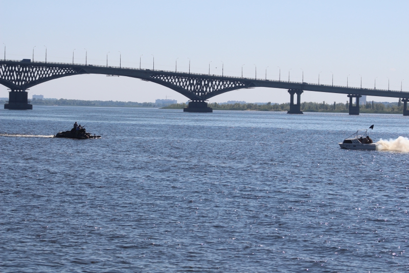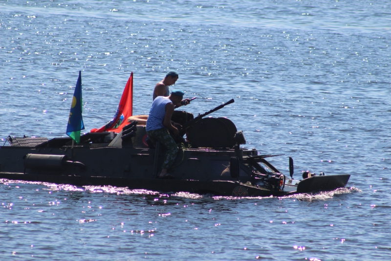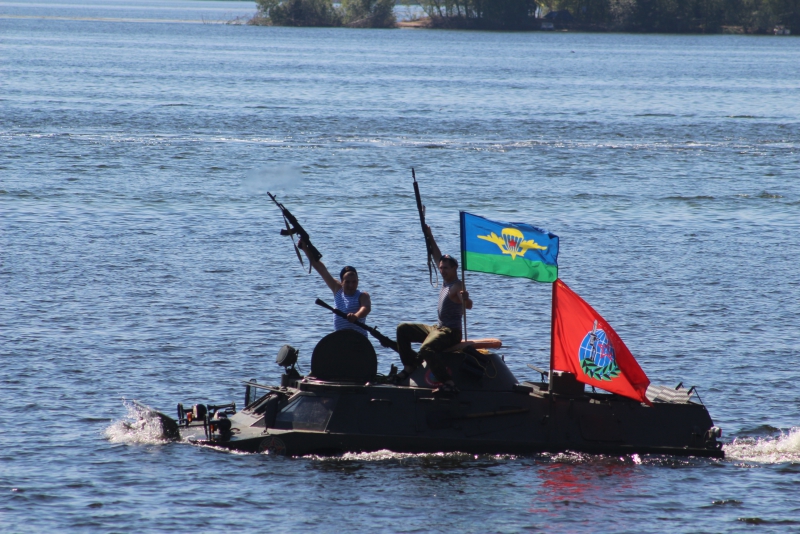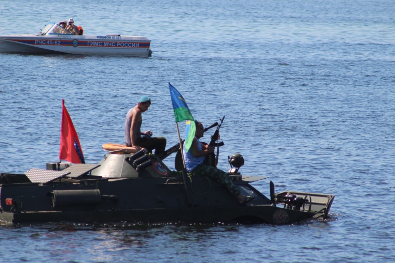 Около 11.00 в акватории Волги рядом со зданием бывшего кинотеатра «Экран» для десантников и рядовых саратовцев устроили показательные выступления с захватом корабля. Для этого специально задействовали БРДМ-2 (Бронированная разведывательно-дозорная машина-2). Особенность машины состоит в том, что она может передвигаться как по суше, так и по воде. По легенде, десантникам на БРДМ-2 нужно было захватить катер противника, который отстреливался. Через несколько минут после «перестрелки» машина приблизилась к катеру, с нее спрыгнул в воду военнослужащий и поборол соперника, которого потом поднял на борт и там скрутил.