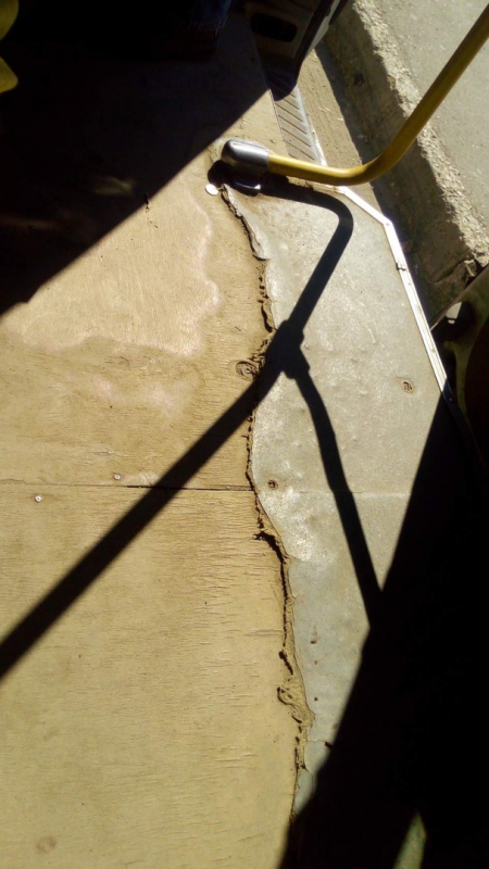 На приложенных к посту снимках видно, что пол заделан фанерой, на нем сверху возле автоматической двери заметна часть оборванного линолеума. Дверная обшивка чем-то пробита, по ней расползлись трещины.
