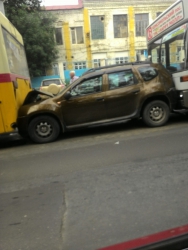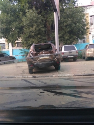 На фото видно, что «Рено Дастер» оказался зажат между двумя автобусами. Из таблички на одном из них следует, что он ездит по маршруту №6 (ходит от Комсомольского поселка до торгового центра «Хэппи Молл»). У кроссовера повреждена передняя и задняя часть кузова, пострадали фары, капот, бампера, задняя дверь.