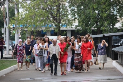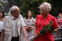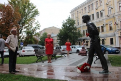 Делегация под предводительством министра культуры Татьяны Гараниной и режиссера, художественного руководителя ТЮЗа Юрия Ошерова положила цветы к подножию памятника, где Табаков изображен в роли Олега Савина из фильма «Шумный день».