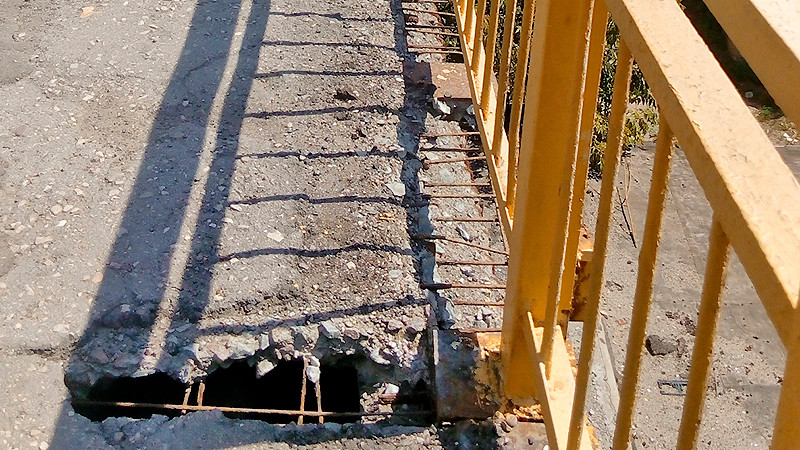 Речь идет о пешеходной части строения, расположенного на улице Степана Разина. На опубликованных снимках видно, что тротуар покрыт провалами, о выступы которых прохожие могут споткнуться и упасть. Там и здесь заметна арматура. Надпись на информационной табличке гласит, что путепровод обслуживает МП «Мост-с».