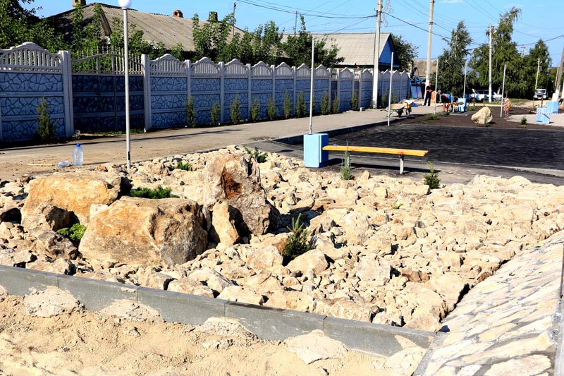 Так, на территории будущего сквера «У вертолета» появилась большая альпийская горка и каменный сад. Валуны «дикого» камня привезены из Тепловского карьера Ново-Бурасского района. Естественный каскад природного склона, подчеркнутый камнями, плавно переходит в каскад лестниц, даже фонтан здесь будет каскадный – уже закончена кирпичная кладка его чаши. Конечно, «каменистый сад» станет только одной из зон будущего сквера, который, кстати, семимильными шагами приближается к тому, чтобы стать настоящим. Газонная трава засеяна на территории зелёной зоны, в зоне отдыха установлены лавочки и урны для мусора. От проезжей части сквер теперь отделяет декоративное ажурное ограждение, его узоры гармонично продолжают дизайн и связывают его с другими зонами отдыха, объединяя их в единый ансамбль.