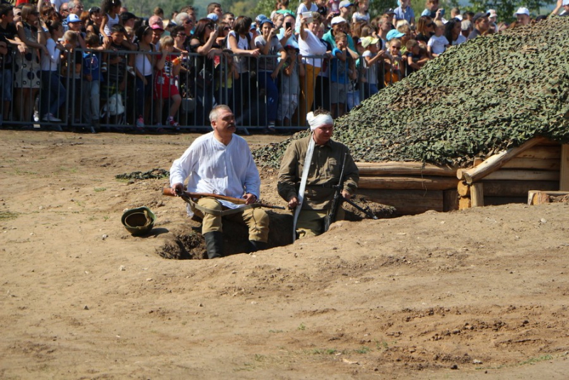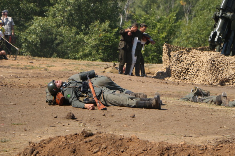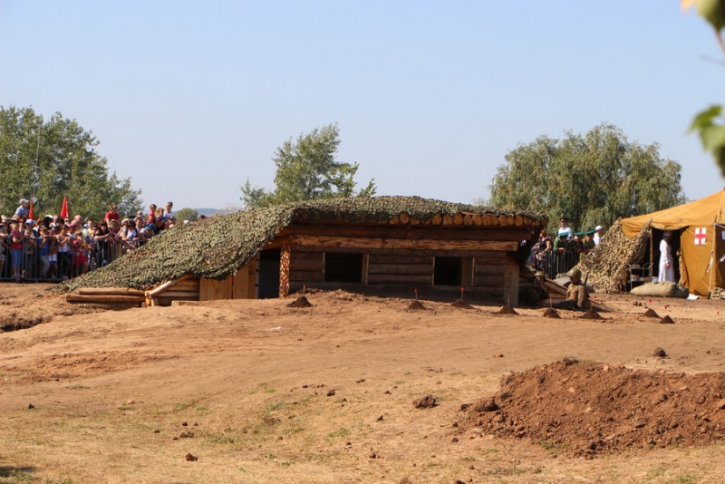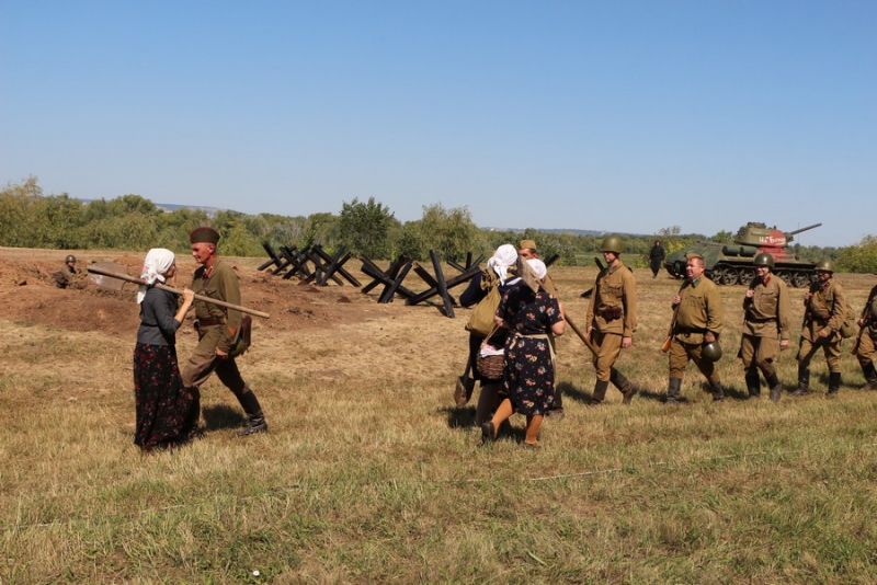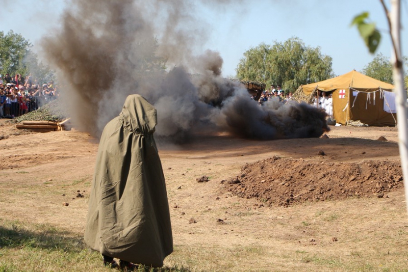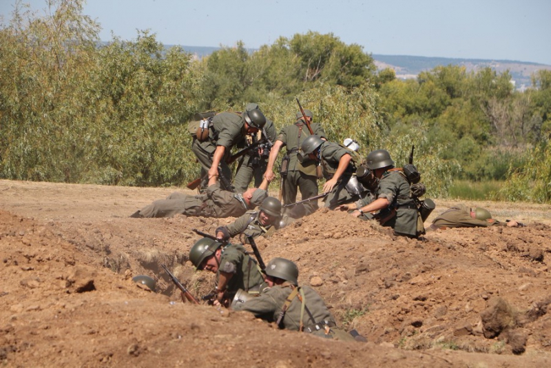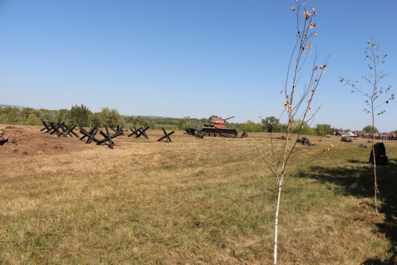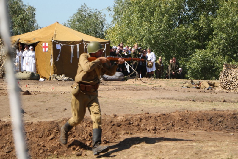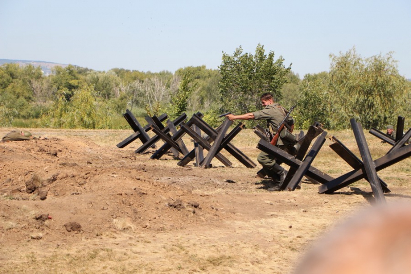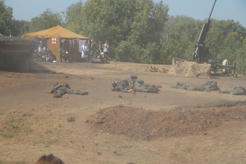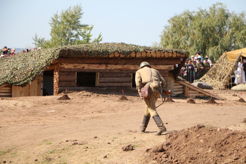 Уникальность «Патриоту» придает площадка для реконструкции военных действий. Сегодня в рамках церемонии открытия там воссоздали эпизод августа 1942 года на подступах к Сталинграду. На этом месте установили два танка (один советских войск, второй – фашистских), фюзеляж, разрыли несколько окопов, которые разделили с линией врага противотанковыми «ежами». В фюзеляже разместились девушки-радистки, по соседству развернули палатку санитары. Перед началом действа санитарки аккуратно сворачивали бинты, а солдаты отдыхали. Как только все гости разместились за железными ограждениями на смотровой площадке, началось «наступление» фашистских захватчиков на Сталинград. Около 20 реконструкторов в форме немецкой армии с автоматами и пулеметами в руках начали стрелять в сторону окопов, где их уже ждали советские воины. Во время перестрелки несколько раз гремели взрывы, имитирующие выстрелы гаубицы, а также разрывы гранат.